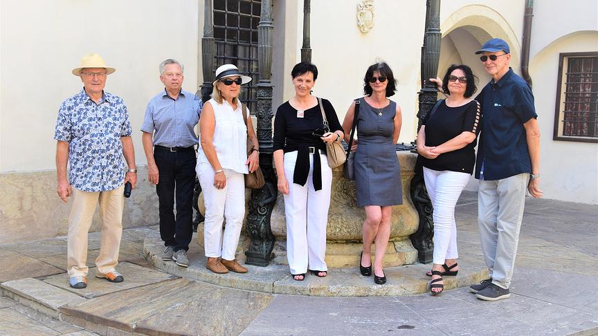 Maria Tiefenbach begrüßt die Gewinner am Hauptplatz Graz vor dem Erzherzog Johann Brunnen zur Stadtführung.